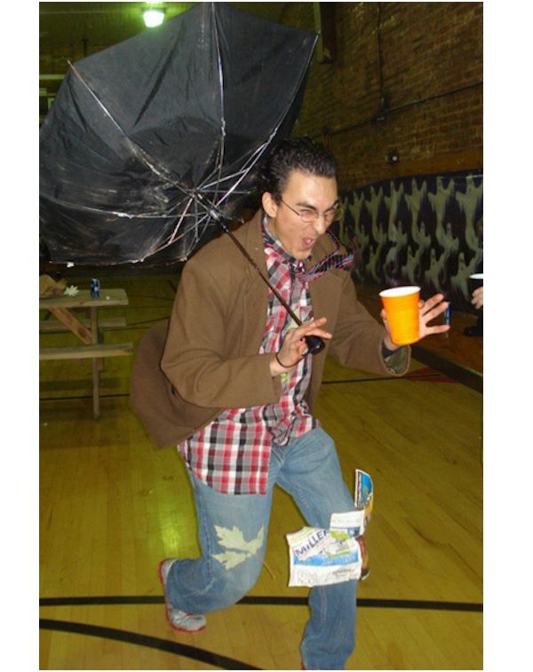 Ponte la ropa que más te apetezca, un jersey, una franela, un pantalón de jean, etc. Si eres chica y quieres verte muy sexy, puedes ponerte una bonita falda y dejar que el viento la levante en ciertos lugares estratégicos. Puedes hacerlo sujetando la falda por dentro con alambres muy delgados. Para dar el efecto de día ventoso, pega algunos papeles en tu ropa como si el viento los sostuviera. Alborota un poco tu cabello y como complemento y golpe de efecto, un paraguas dado vuelta que sostendrás hacia atrás como si el viento quisiera arrebatártelo de las manos. Originalísimo ¿verdad?