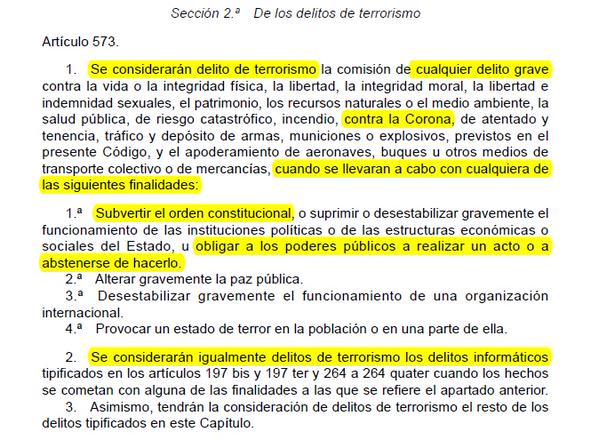 Aparte de eso, han hecho público un fragmento de nuestra constitución en la cual se puede ver como si está considerado como terrorismo. Se puede leer en el fragmento que os vamos a dejar debajo de estas frases, como se considera delito de terrorismo todo lo referido a un ataque contra la vida o la integridad física de la corona – entre otros-, así como su libertad o integridad moral.