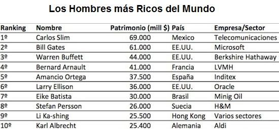 Forbes ha publicado recientemente la lista de los hombres más ricos del 2012, manteniéndose en las tres primeras posiciones de los mas ricos igual que en 2010 y 2011, con Carlos Slim, Bill Gates y Warren Buffeff, en primera, segunda y tercera posición respectivamente. Carlos Slim ha reducido sus diferencias respecto a Bill Gates, viéndose reducida la fortuna del mexicano en 5.000 millones de dólares y Bill Gates aumentó su fortuna superando los 61.000 millones de dólares.
