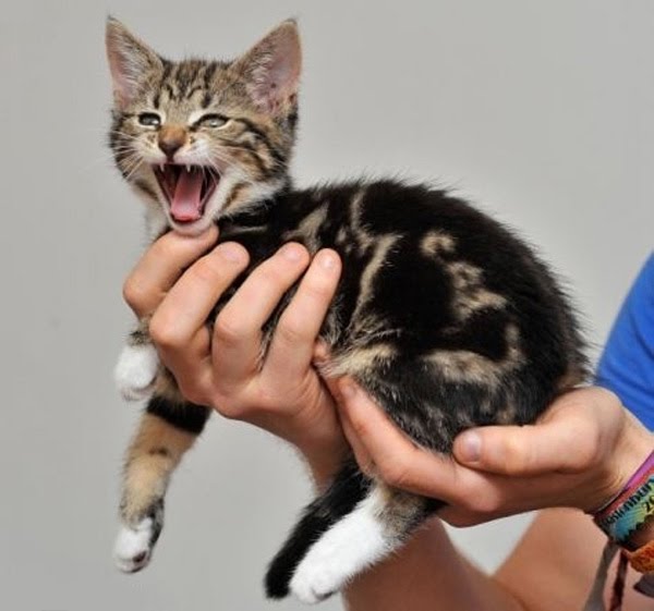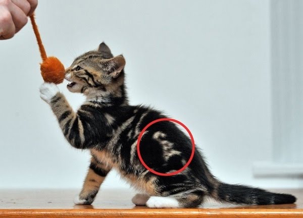Este hermoso gatito, con patrón de coloración atigrado de diez semanas de edad, llamado Polly, tiene “escrita” la palabra cat (gato, en ingles) en su flanco izquierdo.