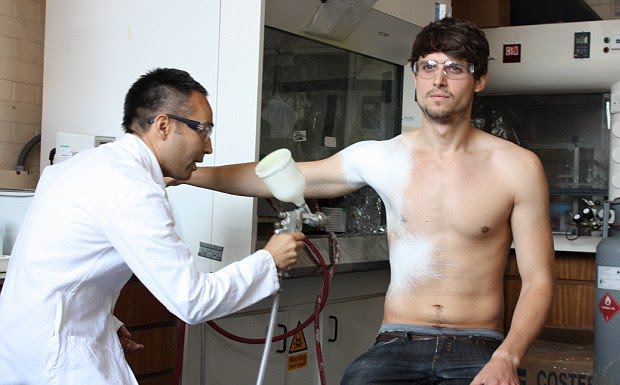 Primera etapa: Esto podría hacerte un poco de cosquillas… El Dr. Torres utiliza las pinturas en espray sobre los hombros y el torso del modelo. Ambos llevan gafas para proteger sus ojos.